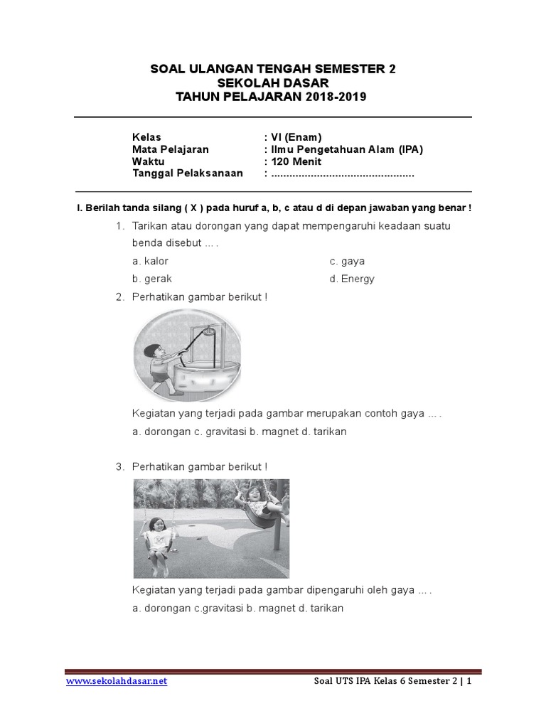 Pelajaran IPA untuk kelas 6 atau untuk tingkat SDMI ialah salah satu mata pelajaran yang terdapat di setiap sekolah negri dan swasta. BERILAH TANDA SILANG X PADA HURUF A B ATAU C PADA JAWABAN YANG BENAR. Inilah pembahasan soal dan jawaban Latihan UTS dan PTS untuk siswa kelas 3 SD Pelajaran IPA semester genap dilansir dari berbagai sumber.